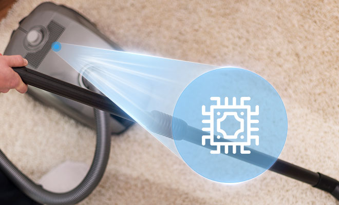 内置灰尘检测微系统,根据检测到的灰尘量自动调整吸力电机的速度和吸力,保持清洁效率的同时节约能源
