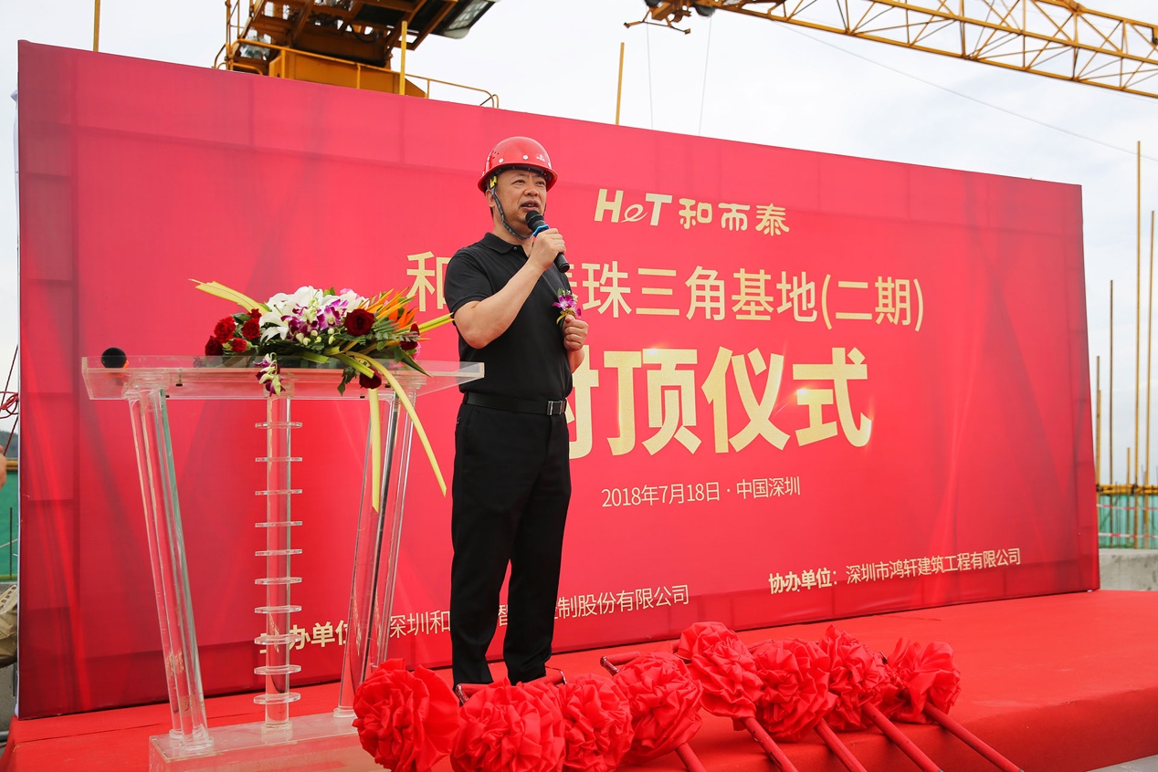 和而泰珠三角基地二期工程于2017年7月份在深圳光明正式开工建设,历时一年时间,目前主体结构已完成,并将进入后期装修及连廊工程。和而泰董事长刘建伟先生在封顶仪式现场发表致辞,他表示随着二期的建成和投入使用,公司将在整体产能方面增长迅速,促使公司成为行业内具有绝对竞争优势的企业,从而更好的为全球客户提供更好的服务。刘总还表示,公司还在工艺、设备、研发等方面做了规划提升,提高工厂自动化程度,建设自动化智慧工厂。